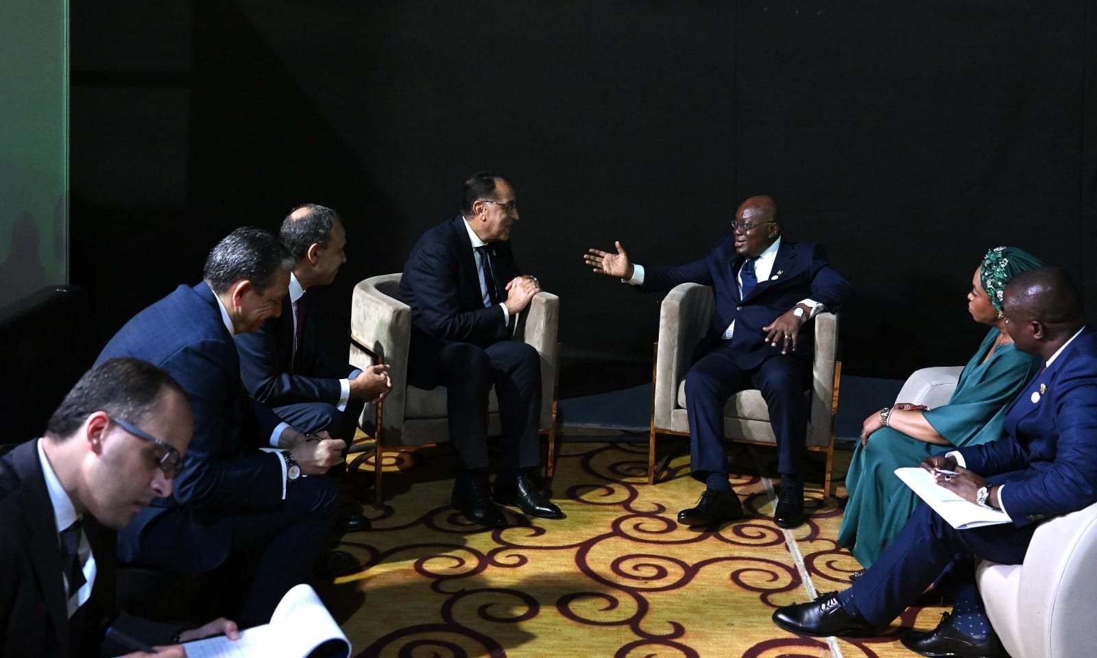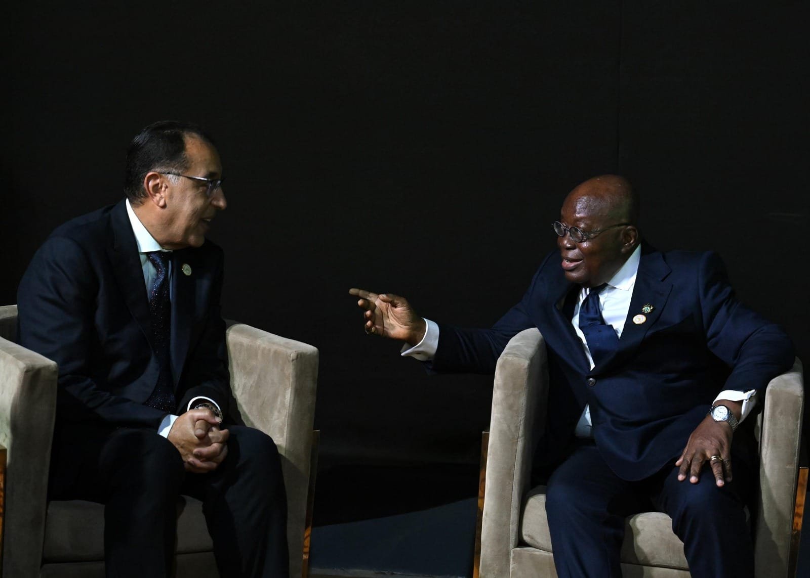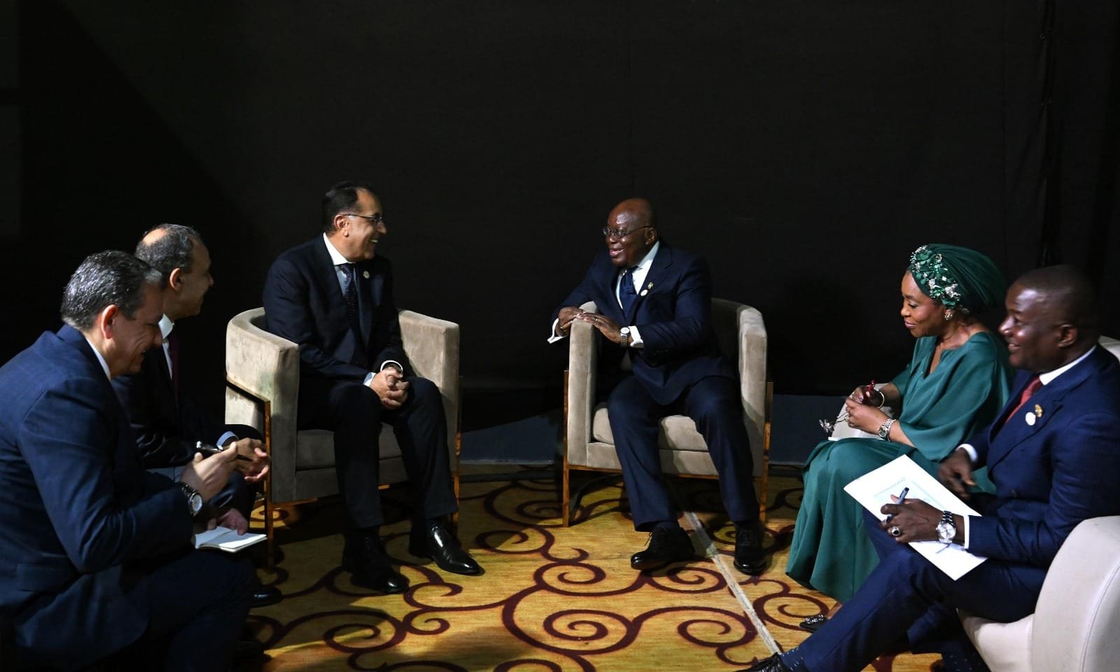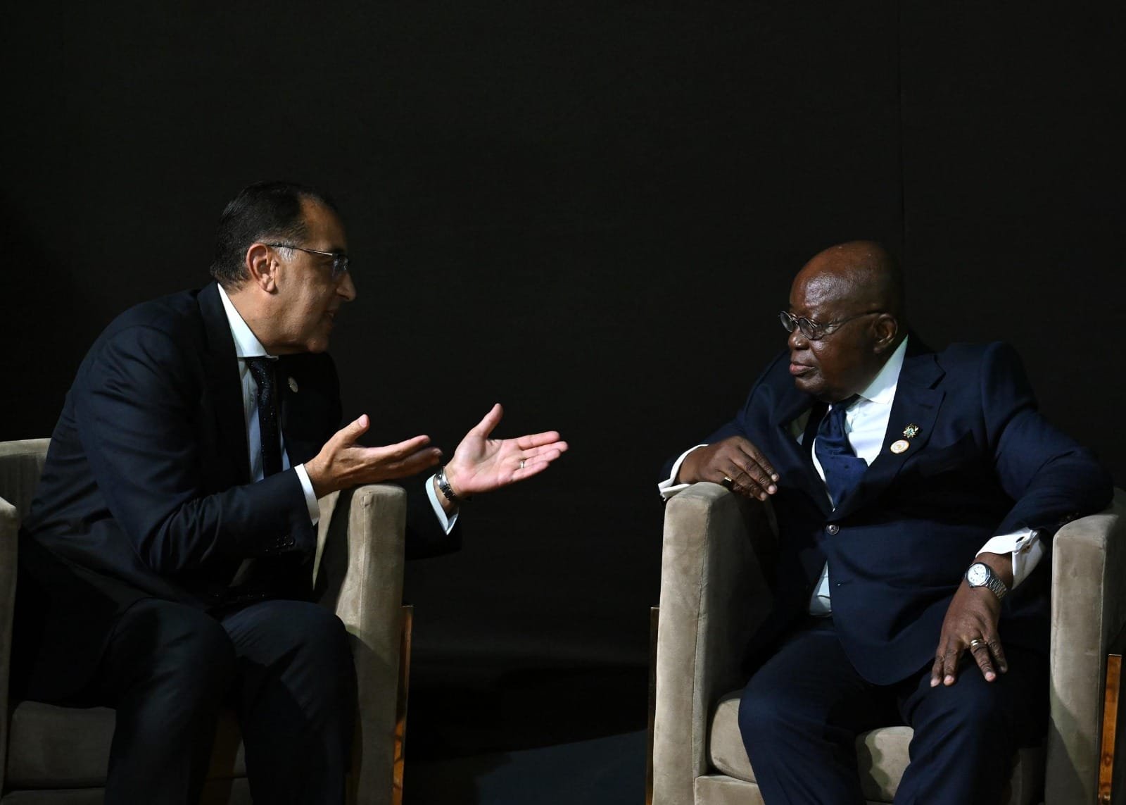 وخلال اللقاء، رحب رئيس جمهورية غانا بالدكتور مصطفى مدبولي، مؤكداً قوة العلاقات بين البلدين، وتطلعه لتوثيق العلاقات بين الجانبين في كافة المجالات أخذاً في الاعتبار الدور الهام الذي تلعبه الشركات المصرية العاملة في مجال التعدين والبنية التحتية والإنشاءات.