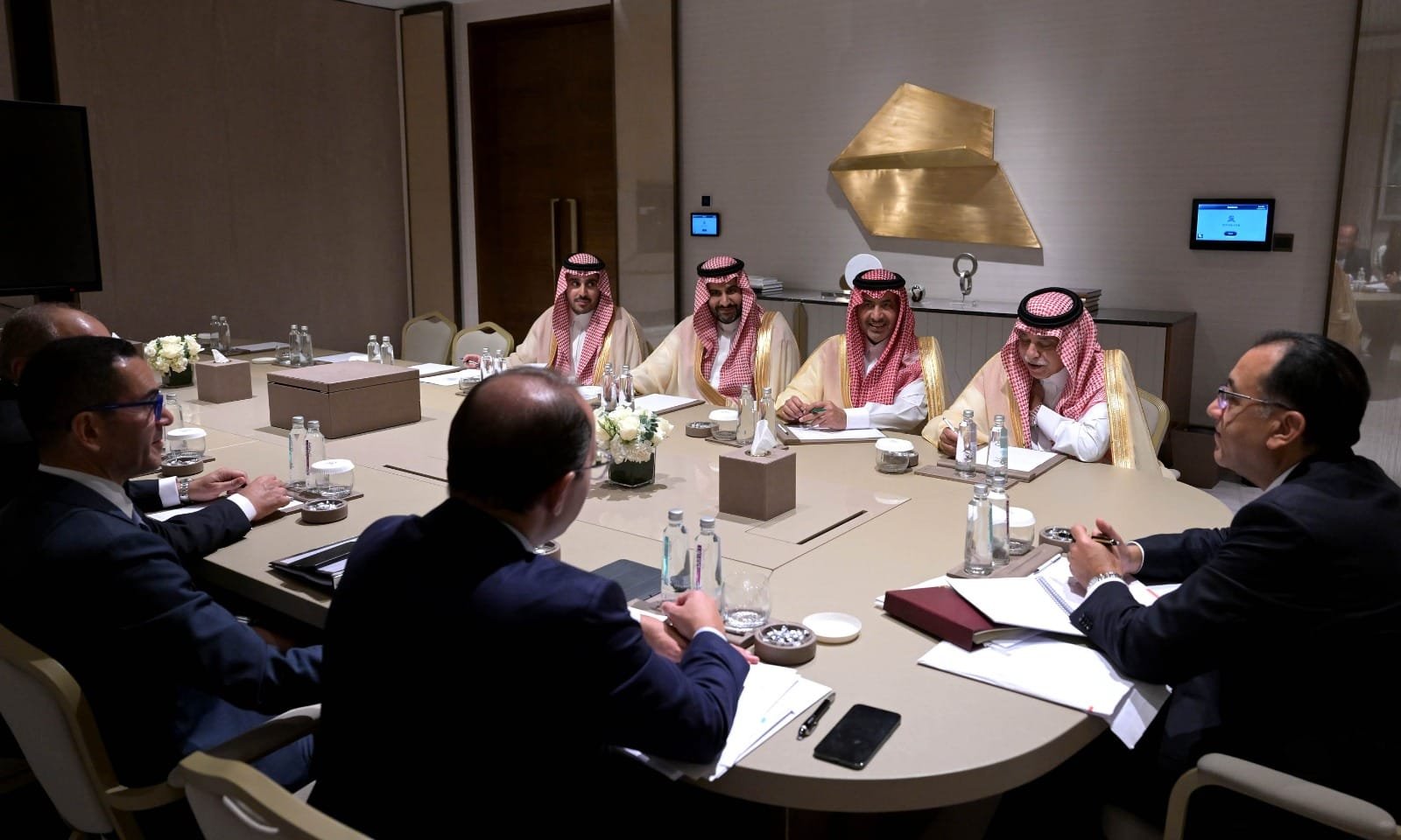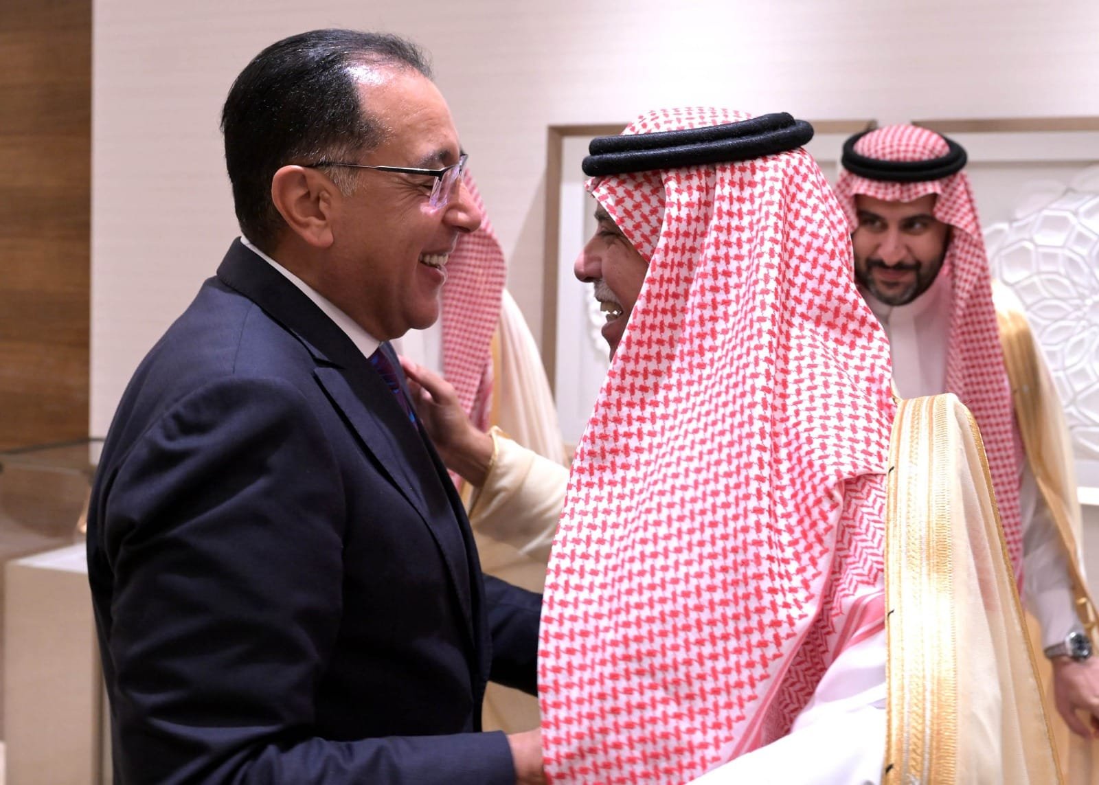 التقى الدكتور مصطفى مدبولي، رئيس مجلس الوزراء، خلال اليوم الأول لزيارته الحالية إلى العاصمة السعودية، الرياض، الدكتور/ ماجد بن عبدالله القصبي، وزير التجارة السعودي، لبحث ملفات التعاون المشترك، وذلك بحضور السيد/ أحمد كجوك، وزير المالية، والمهندس/ حسن الخطيب، وزير الاستثمار والتجارة الخارجية، والسفير/ أحمد فاروق، سفير مصر لدى الرياض، والسفير/ صالح بن عيد الحصيني، سفير المملكة العربية السعودية لدى مصر.
